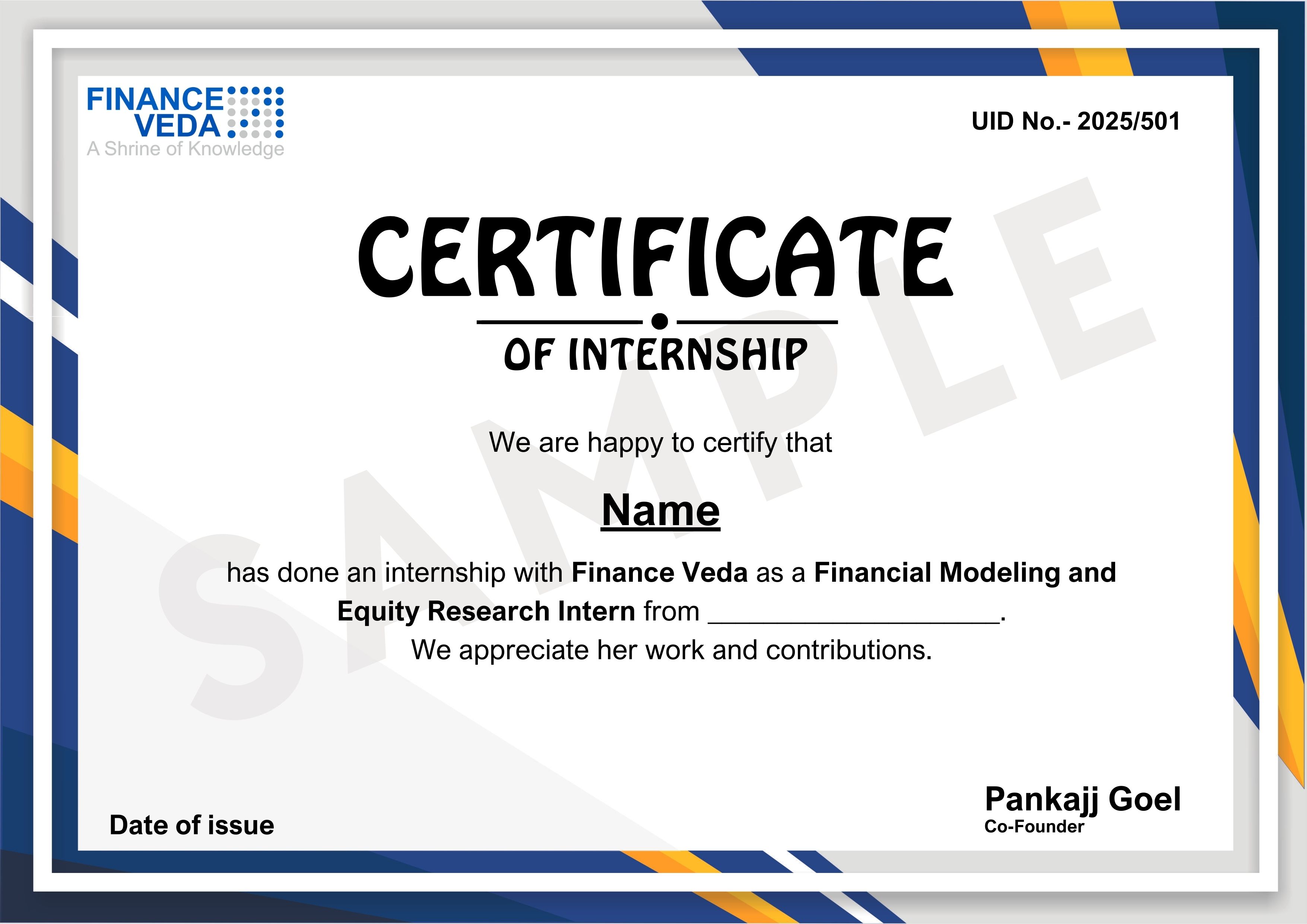 Certification: Upon enrollment in the program, students will receive an Internship Offer Letter. Post-completion of projects, candidates will be awarded a Certificate for Mastering the Fundamentals of Financial Modeling and a Certificate for Excelling in the Basics of Equity Research. Additionally, based on performance, candidates will be awarded a Letter of Recommendation and an Internship Certificate upon successful completion of the internship period. This certificate serves as tangible evidence of their skills and can enhance their credibility and competitiveness in the job market.